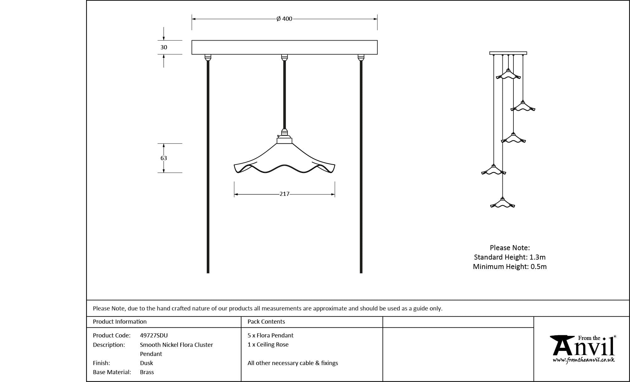 Overall height (from top of ceiling rose to bottom of lowest pendant) 1.3m as standard, pendant heights can be bespokely altered to your preference if needed.