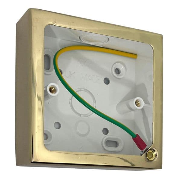 Durable surface mounted wall box with a metal polished brass outer cover. Switch or socket can then be mounted on top of the pattress box (44mm depth). Pattress box only, switch or socket not included (must be bought separately).