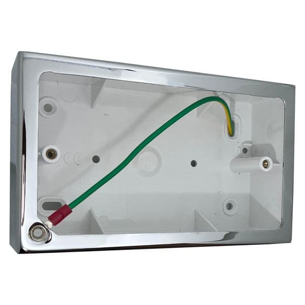 Durable surface mounted wall box with a metal polished chrome outer cover. Switch or socket can then be mounted on top of the pattress box (44mm depth). Pattress box only, switch or socket not included (must be bought separately).